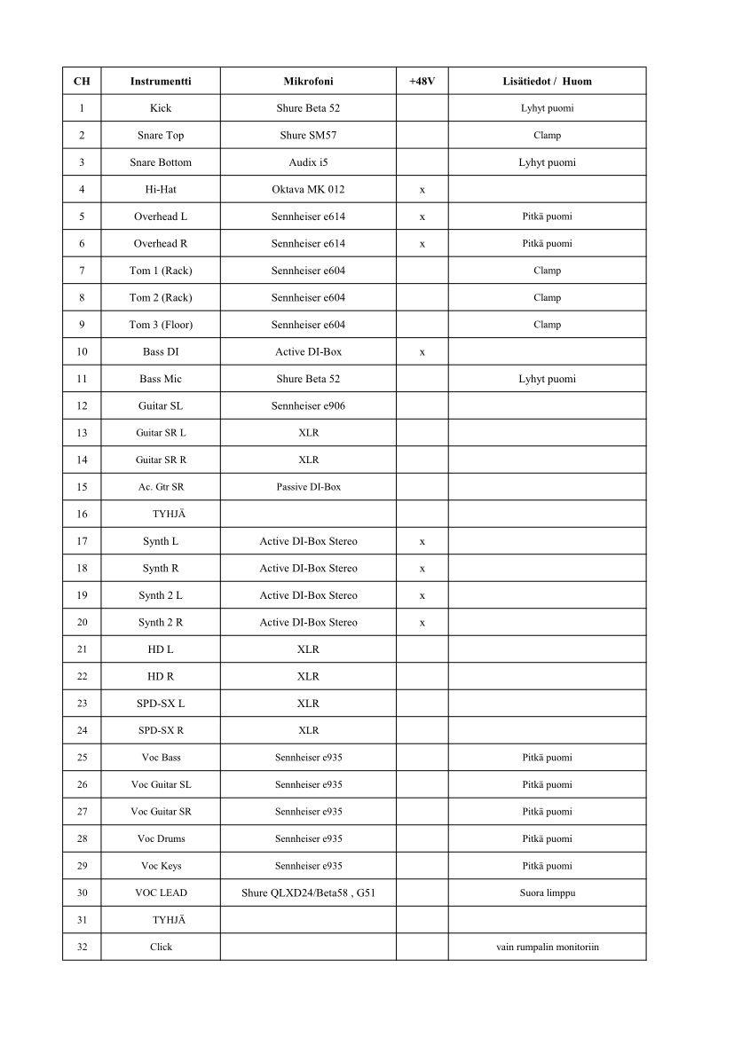 Listasta selviää mikrofonitoiveet/ehdotukset kullekin instrumentille. Toki näistä pystytään yleensä keskustelemaan, eivät ole kiveen hakattuja. Ja samaisesta listasta käy ilmi mikrofonitelineiden tyypit, että halutaanko lyhyttä, pitkää, puomillista / puomitonta ja vaikka limpulla.